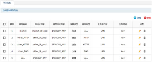 点击“安全管理>访问控制”,点击+新增,添加策略规则:允许市场部访问所有网络应用,如下图所示: