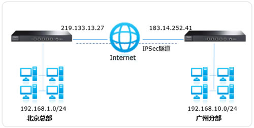 该类型下,确保总部和分部的路由器均连接宽带上网正常,按照以下方法配置VPN隧道: