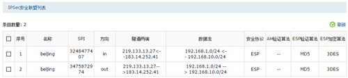 在 IPSec > IPSec安全策略,安全联盟中有对应隧道条目,表明IPSec隧道建立成功,如下图:
