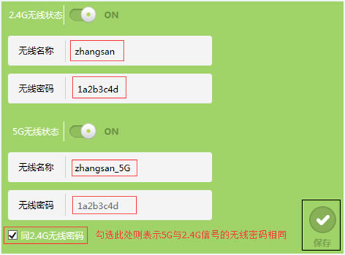 设置2.4G和5G的无线名称、无线密码,点击 保存,如下图: