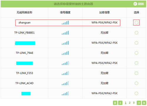 注意:信号列表可能不止一页,可以点击向右箭头进入到下一页。如果无法扫描到主路由器信号,请减小路由器之间的距离或障碍物。