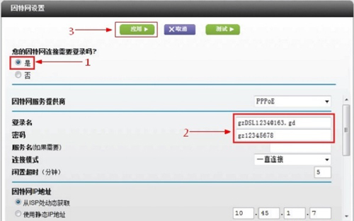 点击“基本”——>“因特网设置”——>“您的因特网连接需要登录吗”选择:是——>“因特网服务提供商”选择PPPoE——>在“登录”和“密码”后面的空白栏中分别输入:宽带的帐号、宽带密码——>“因特网IP地址”选择:从ISP处动态获取——>点击“应用”如下图: