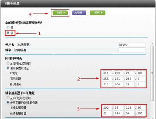 选择菜单“基本”——>“因特网设置”——>“您的因特网连接需要登录吗”选择:否——>“因特网IP地址”选择:使用静态IP地址;然后填写:宽带运营商提供的IP地址、IP子网掩码、网关IP地址——>“域名服务器(DNS)地址”选择:使用下面的DNS服务器;然后填写宽带运营商提供的DNS服务器地址——>点击“应用”如下图: