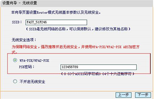 上图所示页面中,可以设置FW150RM的SSID(即无线网络名称)。为防止非法用户蹭网,建议设置无线安全。推荐选择“WPA-PSK/WPA2-PSK”并设置PSK密码(本例为123456789)。