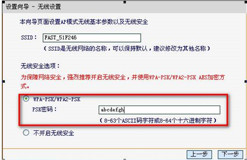 步骤4:选择“AP”,点击“下一步”,弹出无线设置页面,如下图所示。