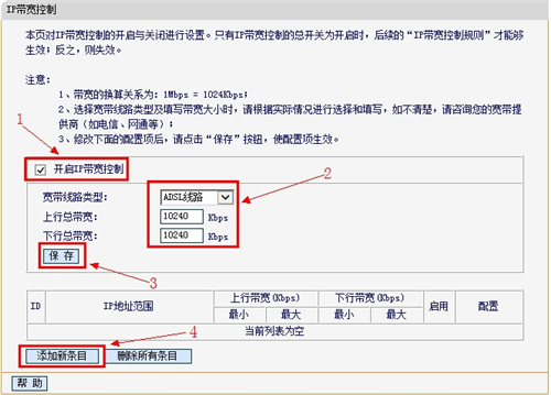 3、设置限速:点击“IP宽带控制”---->勾选“开启IP宽带控制”---->在“宽带线路类型”后面选择你的上网方式---->在“上行总带宽”和“ 下行总带宽”后面填写你的宽带最大值,1M=1024Kbps---->然后点击“保存”---->点击“添加新条目”。