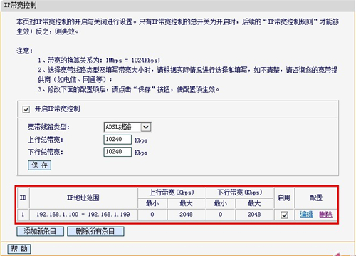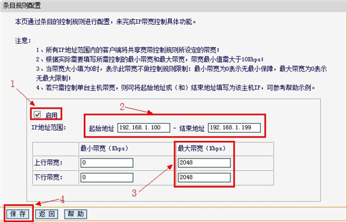 4、勾选“启用”---->在“起始地址”、“结束地址”后面填写第2步记录下的“地址池开始地址”“地址池结束地址”的地址---->在“最大宽带”下面填写允许使用宽带的最大值,例如10M宽带,5太计算机,每一台平均2M,最大宽带设置2048Kbps,当然也可以根据你的实际情况来限制允许使用的最大带宽---->最后点击“保存”。