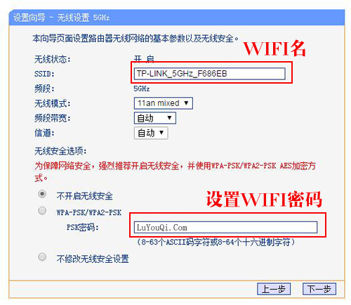 6、5G无线设置。设置“SSID”——>选择“WPA-PSK/WPA2-PSK”——>设置“PSK密码”——>“下一步”。详细设置如下图所示