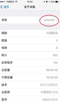 进入了“关于本机”界面,此时我们发现界面的第一行名称,默认的就是该机型iPhone6,点击进入;