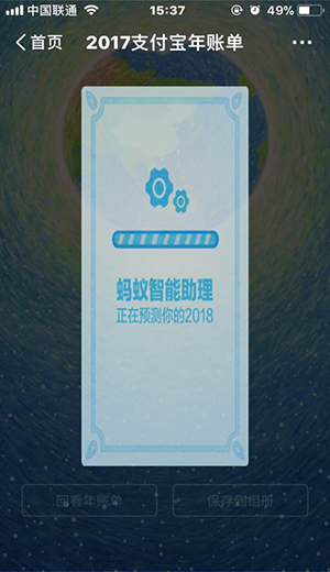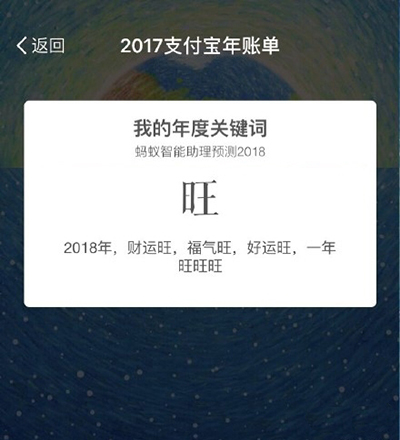 在用户个人的2017个人年度账单最后,支付宝的蚂蚁智能助理会预测用户的2018。微信朋友圈大家也都晒出了自己的年度关键词,通过观察,支付宝的蚂蚁智能助理预测的关键词无非就是“成就”、“纯真”、“潮”、“能干”、“温暖”、“爱”、“颜值正义”、“才华”,这些有趣、正向、涵义广泛的词语。