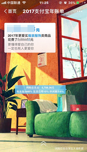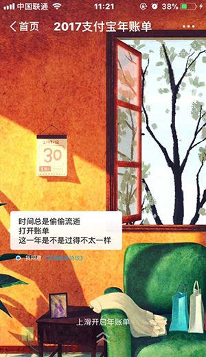 用户打开最新版的支付宝App之后,在支付宝“首页”的动态消息中滑动,即可看到自己的支付宝2017年账单。