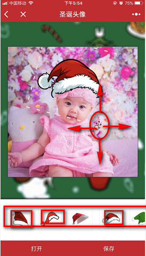 最后,选中帽子中间位置可以移动帽子的位置,在大小和角度都没有问题之后,点右下角保存就可以立即将制作完毕的微信圣诞帽子头像保存到手机相册。然后,亲们将保存在手机相册里面的微信圣诞帽子头像替换掉现有微信头像就可以了。