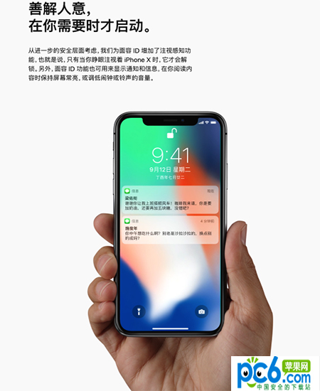 从进一步的安全层面考虑,我们为面容 ID 增加了注视感知功能,也就是说,只有当你睁眼注视着 iPhone X 时,它才会解锁。另外,面容 ID 功能也可用来显示通知和信息,在你阅读内容时保持屏幕常亮,或调低闹钟或铃声的音量。