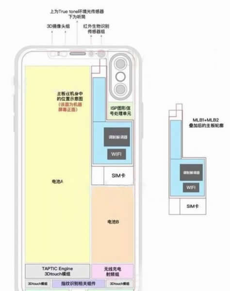 虽然说无线充电技术对于新iPhone来说非常的鸡肋,但是据路透社消息称iPhone 8这次使用了全新的电池排列方式,而且还采用了A/B两块电池的搭配方式,所以在内部的空间排列上,两块电池的组合方式则是以“L”型呈现出来。