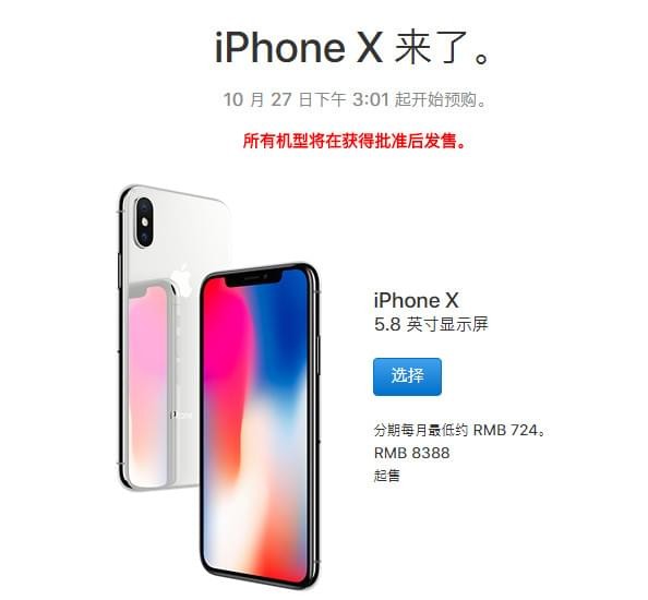 iPhone X 64GB 8388元,256GB版本9688。只有灰色和银色。iPhone 8 5888、iPhone 8 Plus 6688 有三种颜色银色、金色和灰色三种。
