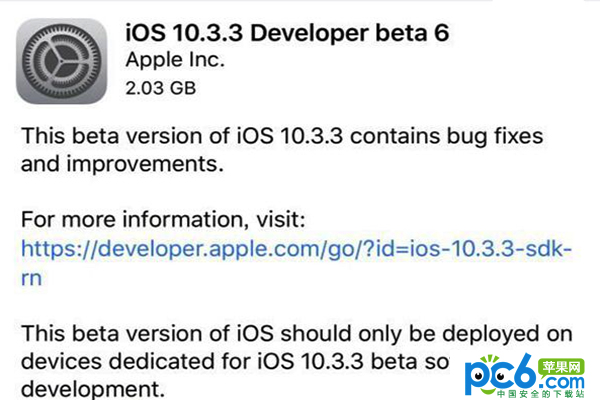 距离iOS 10.3.3 Beta 5系统放出只有一周之后,苹果在今天更新了iOS10.3.3开发者测试版Beta6,本次更新的主要内容是修复Bug和改进,更新包大小为2.03GB。小编这里为有需要的用户提供了iOS 10.3.3 Beta 6固件下载地址。
