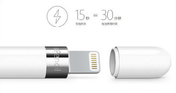 滑开 Apple Pencil 的磁性笔帽,就能看到 Lightning 接口,只要将它插入 iPad Pro 即可充电。我们为接口做了轻微的加长设计,所以就算 iPad Pro 套在硅胶保护壳内,也不妨碍充电。着急了吗?仅需充电 15 秒,就能使用半小时。而完全充满,足以使用 12 小时,让你尽情地涂写、作画、添加附注和编辑*。